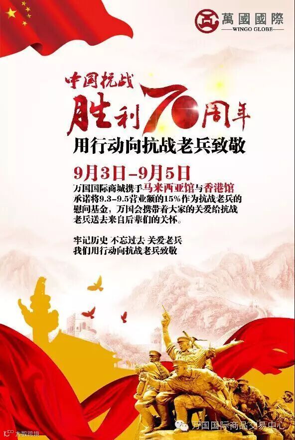 在中国人民抗站胜利暨世界反法西斯战争胜利70周年之际,万国国际商城携旗下香港馆和马来西亚馆向老兵捐出9月3日—9月5日三天营业额的15%,为老兵献上我们的绵薄之力。在此期间,凡在马来西亚馆和香港馆购物的小伙伴,你们都在支持这15%,感恩有你!