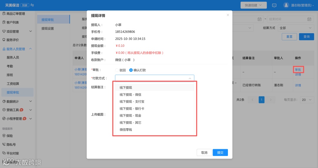 而对于您来说,所有提现申请统一进入审批列表,可随时查看资金记录、核对明细,支持线下打款后确认扣减,也可通过微信零钱直接打款。