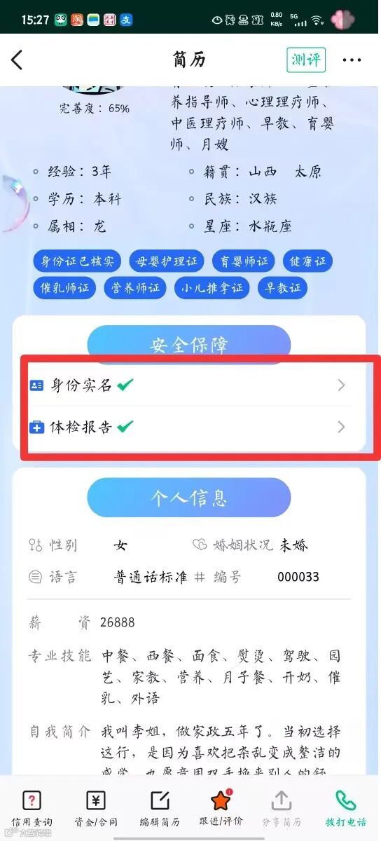 熊猫系统电子简历,可展示身份核实验证、医院直传电子体检报告,雇主就能一目了然地看到阿姨的安全性和可靠性。