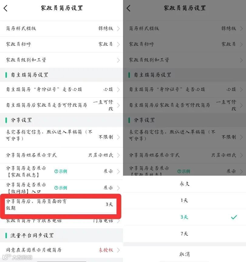 比如推荐阿姨简历的时候,在熊猫系统中设置阿姨简历的有效期1天或者3天,过了时间链接失效,雇主打不开,阿姨也不能拿着家政公司做的简历去签私单。