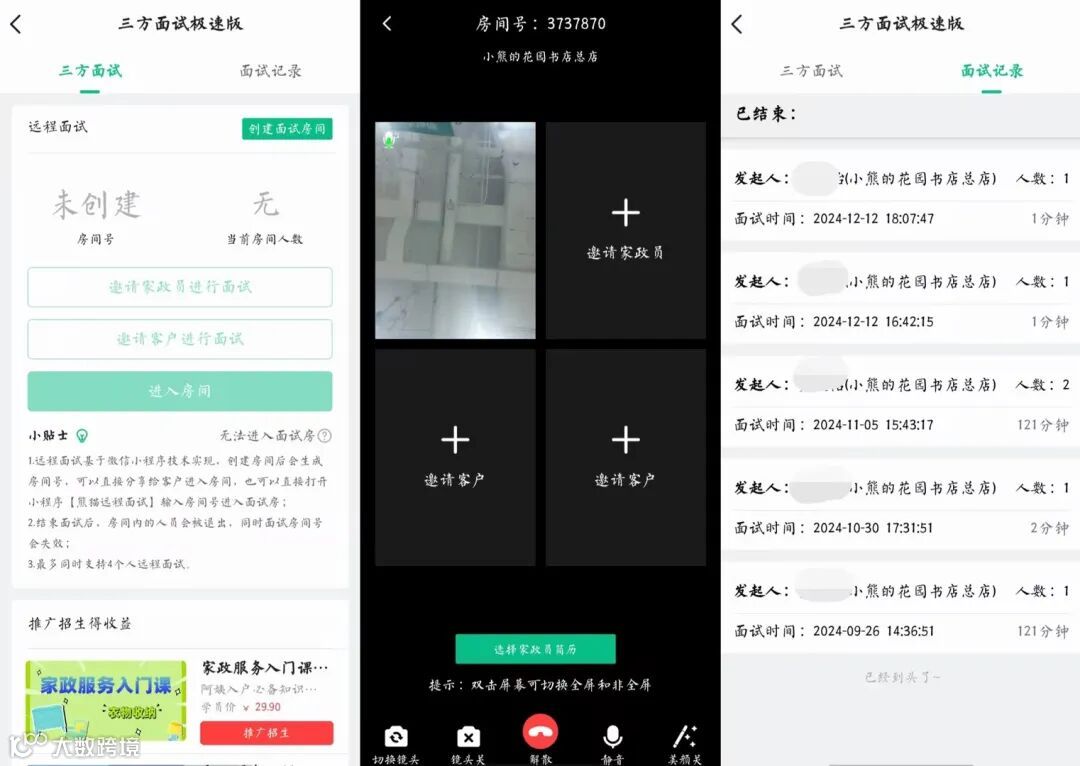 比如,面试的时候,普通的微信拉群面试,很容易就加上联系方式了。使用熊猫系统的三方保密面试,面试全程由家政老师把控,微信不接触,没有添加联系方式的机会。