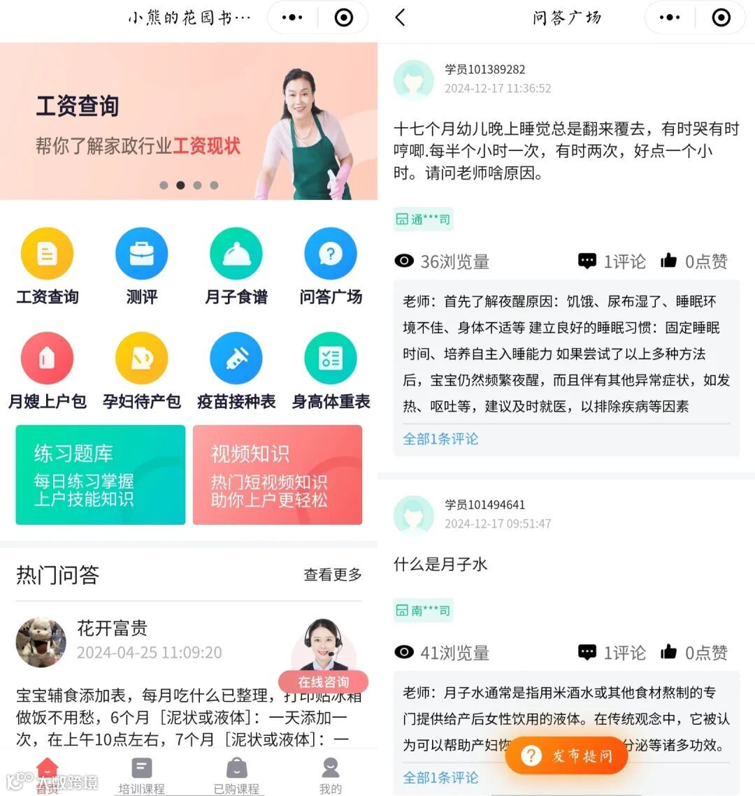 每个来学习的学员,张老师都会免费分享熊猫AI盒子附带的“家政乐园”小程序,有不懂的问题也可以在家政乐园问答广场咨询专业老师。