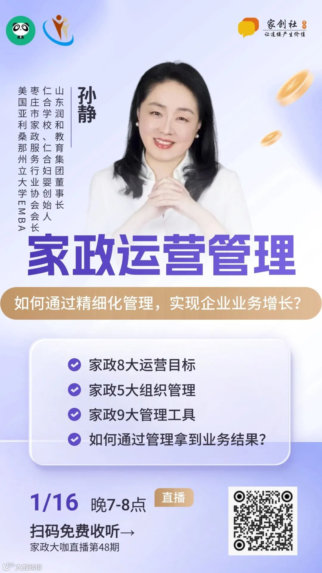 2025业务突破!本周四1月16日大咖公益课程:《家政运营管理》⭐本期嘉宾:孙静山东润和教育集团董事长仁合学校、仁合妇婴创始人枣庄市家庭服务行业协会会长美国亚利桑那州立大学EMBA⭐直播大纲:1、家政8大运营目标2、家政5大组织管理3、家政9大管理工具4、如何通过管理拿到业务结果🌟直播时间:1月16日 本周四晚19:00-20:00