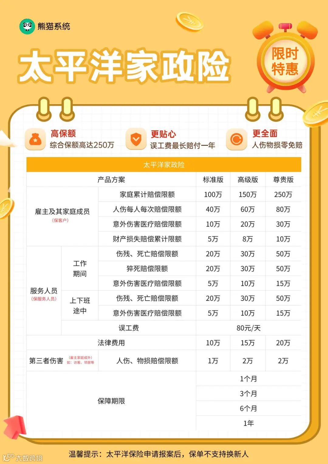 提供家政责任险,保障由于阿姨工作造成的人伤 和雇主家的人伤物损。让雇主没有后顾之忧。