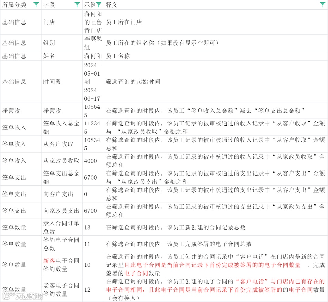 可自动生成员工维度签单业绩报表,涵盖基础信息、净营收、签单收入、签单支出、签单数量等五大核心指标。