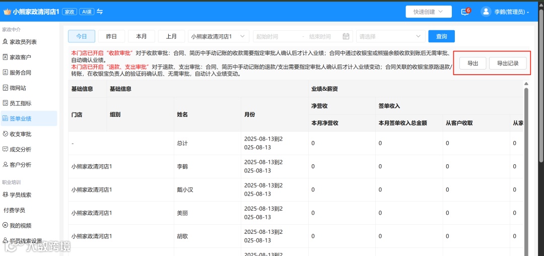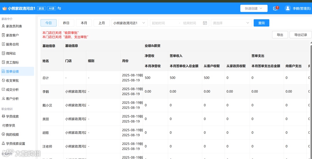 PC端:进入“家政中介”模块→点击【签单业绩】,支持按时间、主管组别筛选,管理员还可导出数据;
