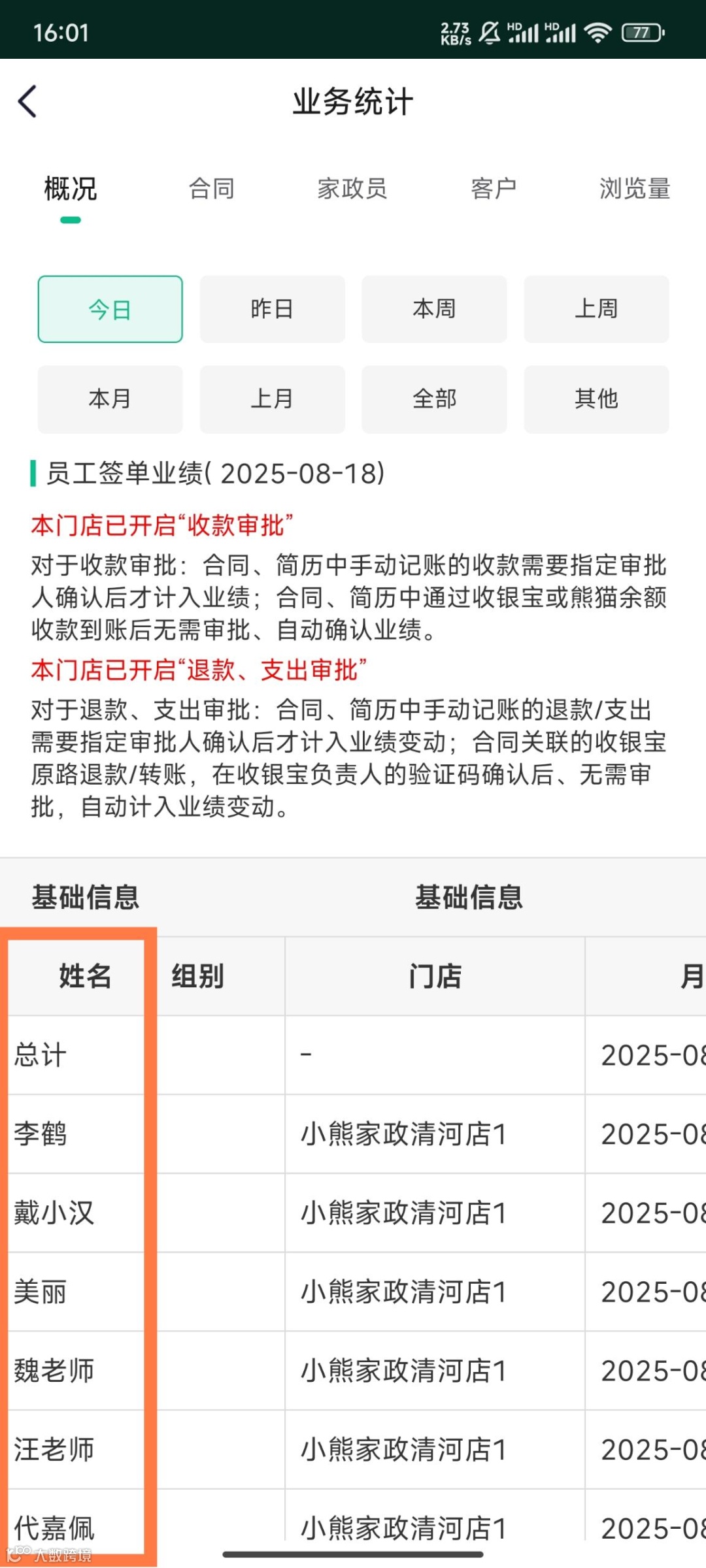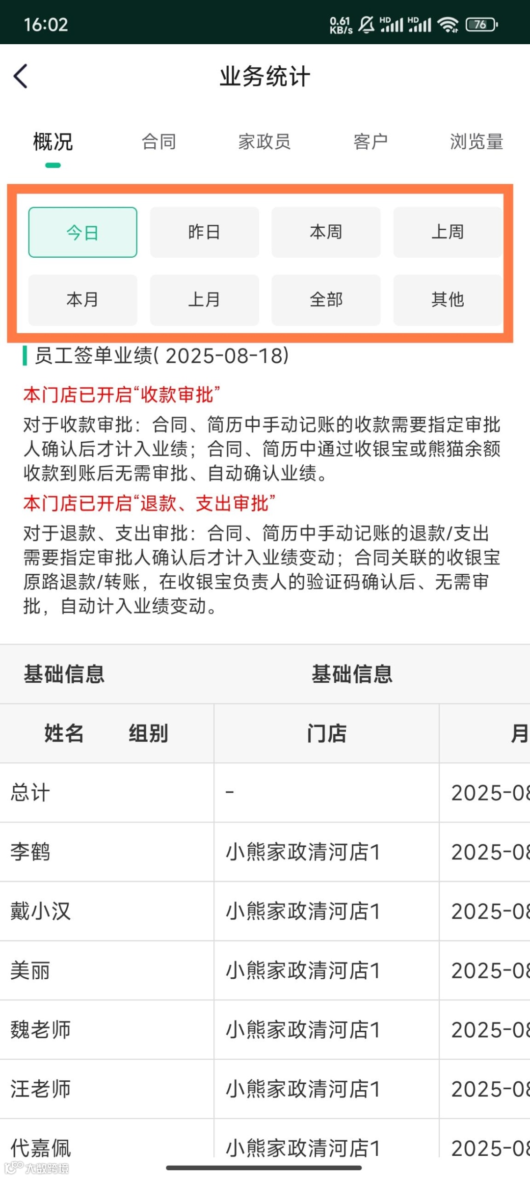 店长及以上:可查看当前门店所有员工的业绩数据;