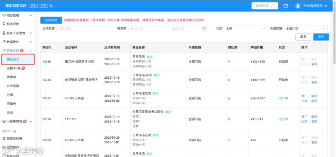 用好系统里的营销工具,比如拼团、储值、优惠券,这些都是经过验证的、适合家政行业的拉新与复购手段;