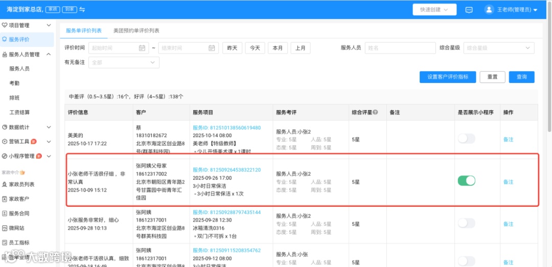 除了获客与转化,公司也在服务流程中注入了更多“留客”的设计。例如,在服务完成后,系统会自动触发客户评价,收集客户反馈,并及时处理投诉。这一闭环管理机制,让客户感受到被重视,差评率显著下降,复购意愿明显提升。
