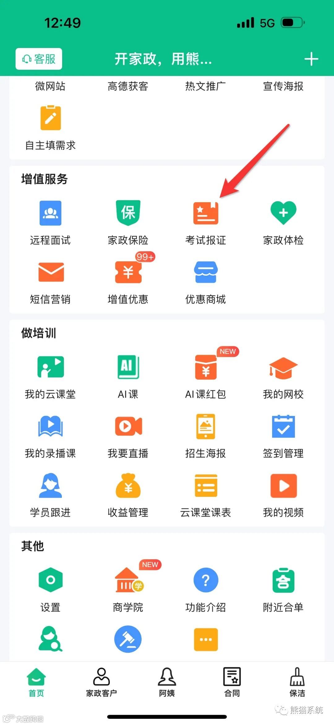 对了,最后还要悄悄告诉你,对培训课程学习完成的阿姨,还可以结合熊猫系统中的考试报证功能进行阿姨的能力认证。