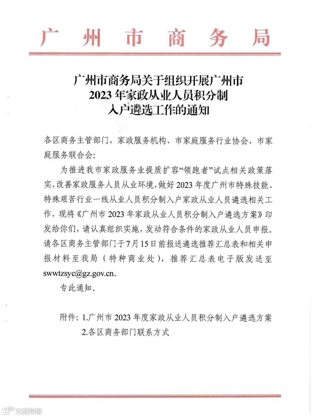 市商务局关于组织开展广州市2023年家政从业人员积分制入户遴选工作的通知