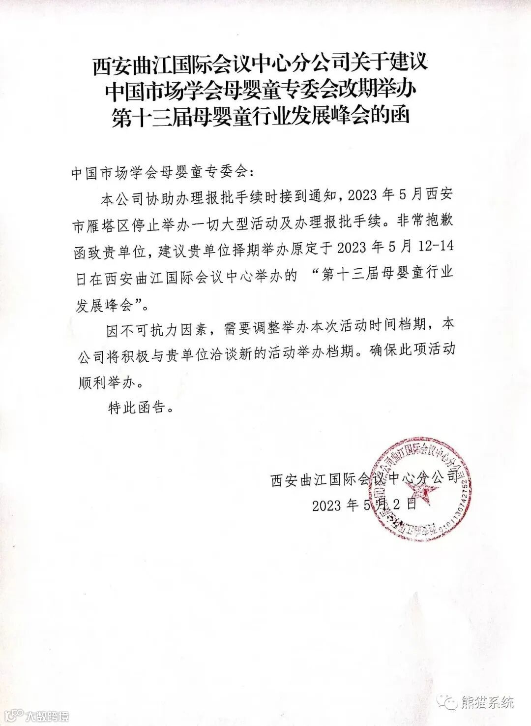 曲江国际会议中心分公司关于建议中国市场学会母婴童专委会改期举力第十三届母婴童行业发展峰会的函》。