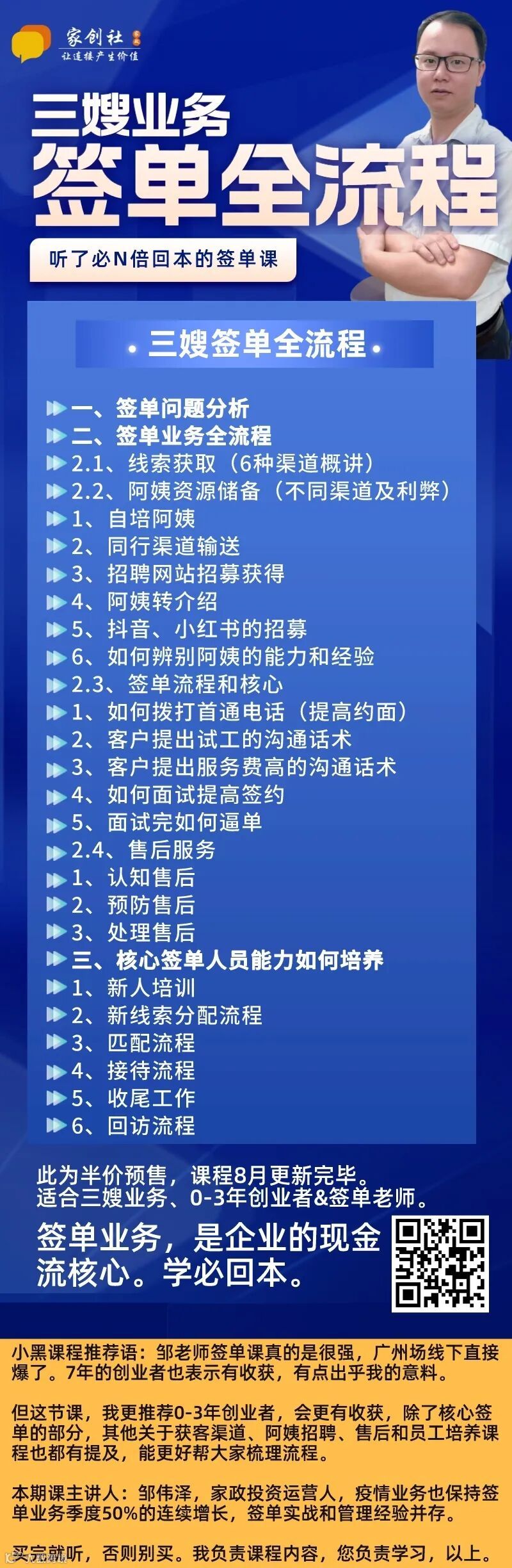 邹伟泽老师为大家解析6大获客渠道;讲解谈单流程与谈单核心;教各位家政老板如何培养核心谈单人员能力,能做到来一单成一单!