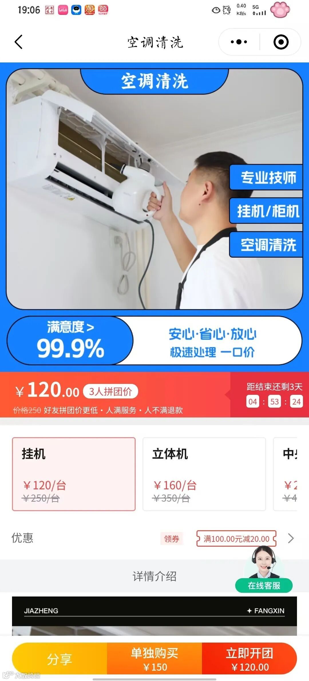 空调清洗-挂机2台-柜机1台,原价349元,拼团价269元