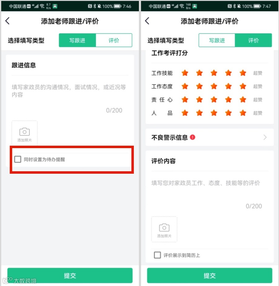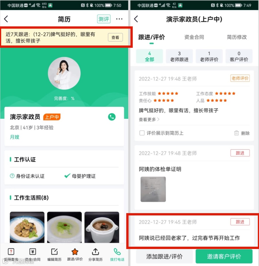 区分阿姨跟进和评价能帮我们更好了解阿姨情况。跟进是我们跟阿姨沟通的记录,评价是我们对阿姨的判断。当家政老师填写跟进记录时,跟进记录可以同步设置备忘提醒。帮老师更好的记录沟通情况、增加对阿姨的了解、把控。