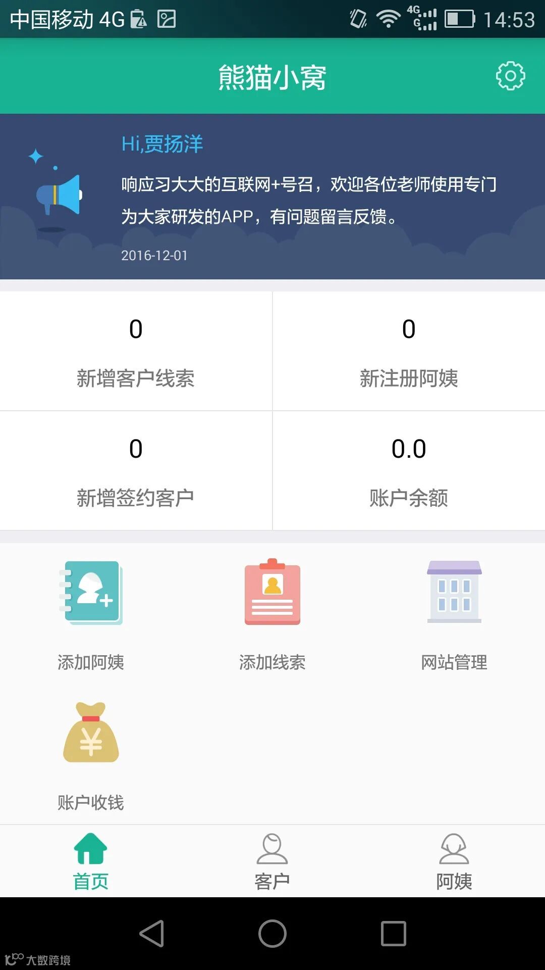 在2016年12月上线的熊猫系统0.1版本中,只有阿姨管理、客户管理等一些基础功能,虽然相较于现在的功能略显简陋,但在当时也绝对算得上是家政行业的一款经营利器,一上线就大获好评,9个月时间,合作客户就突破了1000家。