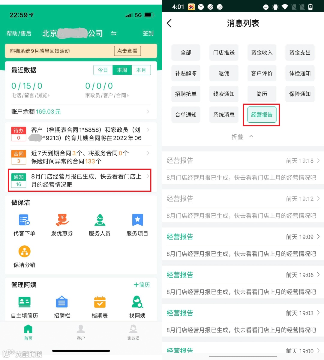 管理员和店长也可从【首页】—>【通知】—>【消息列表】—>【经营报告】中查看经营报告。