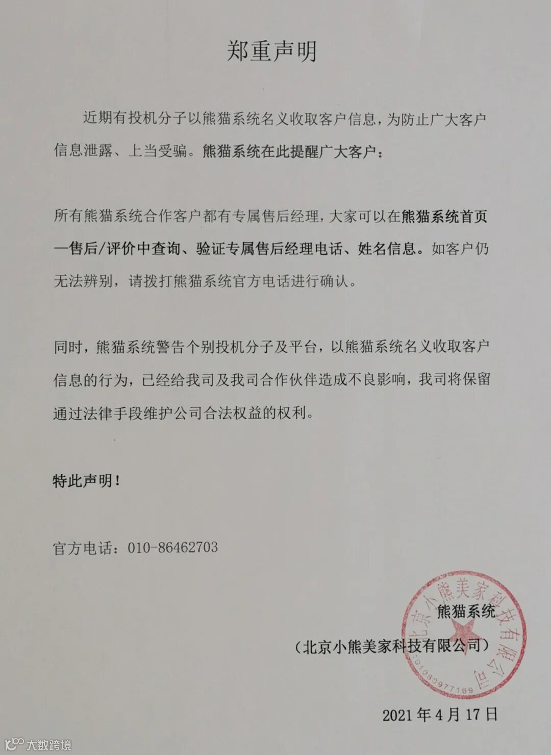 同时,熊猫系统警告个别投机分子及平台,以熊猫系统名义收取客户信息的行为,已经给我司及我司合作伙伴造成不良影响,我司将保留通过法律手段维护公司合法权益的权利。