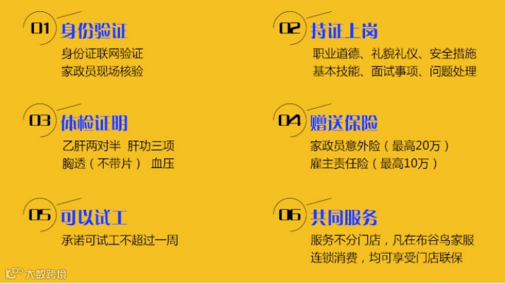 6大承诺是:身份及安全核验 ·持证上岗·健康证明·双向保险·共同服务·专业培训。