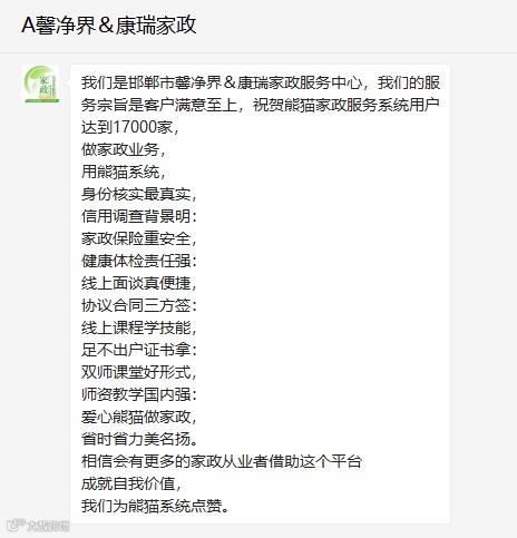 2017年,首发“代买保险、体检预约、微网站”,帮家政公司提升业务效率,扩大宣传途径,同时规避风险、挣更多钱