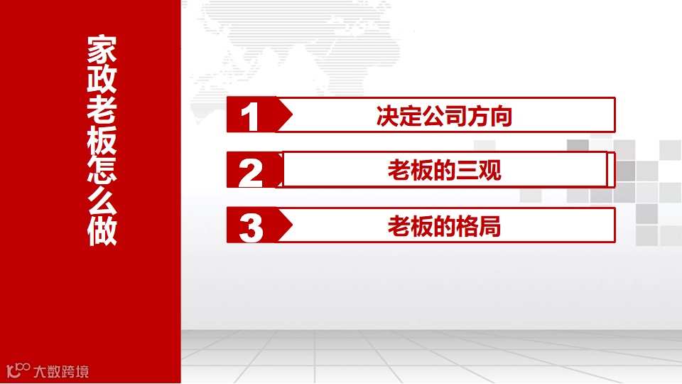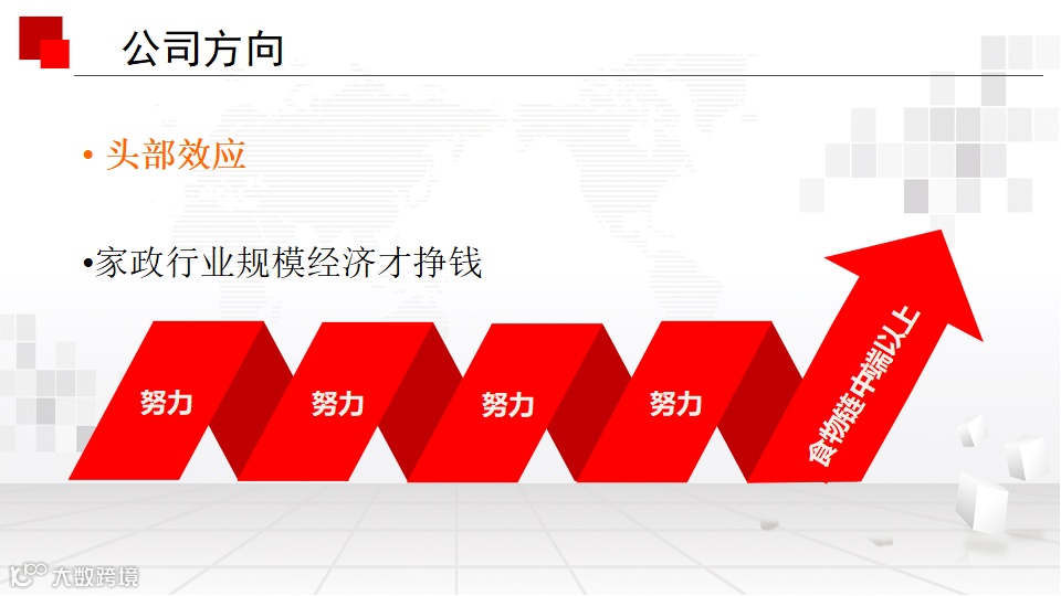 除此之外,要能决定公司方向。20%的公司掌握80%的财富。家政老板要想的是突破,进入到金字塔的顶端20%赚钱。