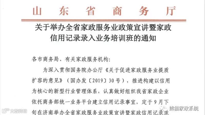 为深入贯彻国务院办公厅《关于促进家政服务业提质扩容的意见》(国办发【2019】30号),推进构建以信用为核心的新型行业管理体系建设,9月26日,山东省商务厅举办的《全省家政服务业政策宣讲即家政信用记录录入业务培训班》在山东济南召开,组织我省家政行业依托商务部统一业务平台建立信用体系。北京小熊美家科技有限公司凭借为家政行业服务的熊猫系统,受邀参加。