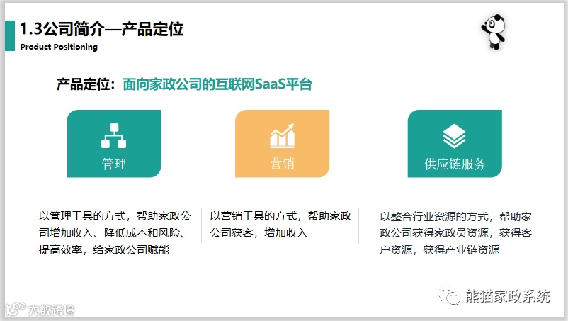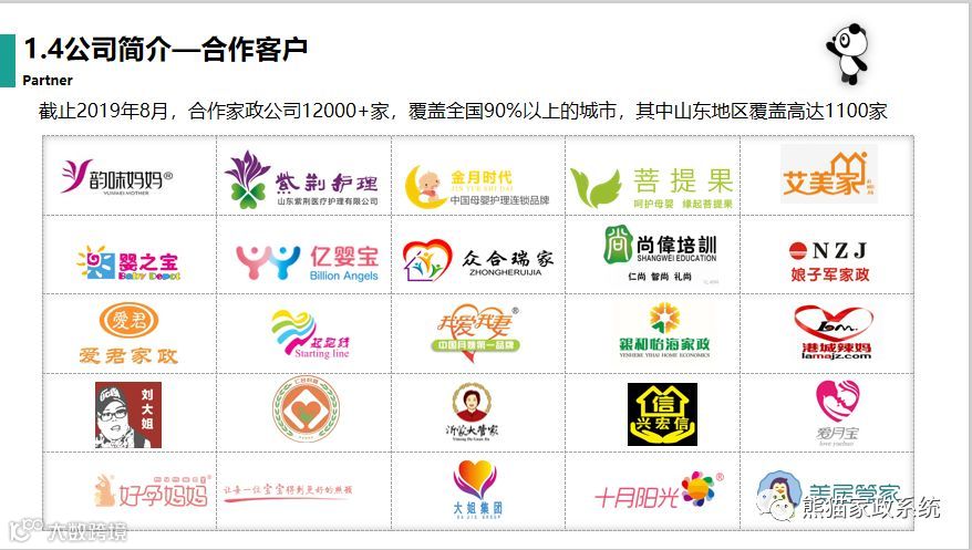 会议举办前期,兴宏信家政集团、好大姐家政、红日升家政、慧馨家政、沂蒙大姐家政、娘子军家政、傻大姐家政、心意达家政、新馨园家政等纷纷为“熊猫系统”送上祝福。“熊猫系统”始终以“互联网让家政更美好为使命”为家政行业服务。截止到2019年8月份,已经合作12000+家家政公司,覆盖全国90%以上的城市。