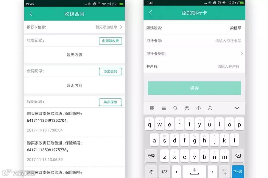 3.阿姨简历,收钱/合同中支持添加阿姨的银行账号。