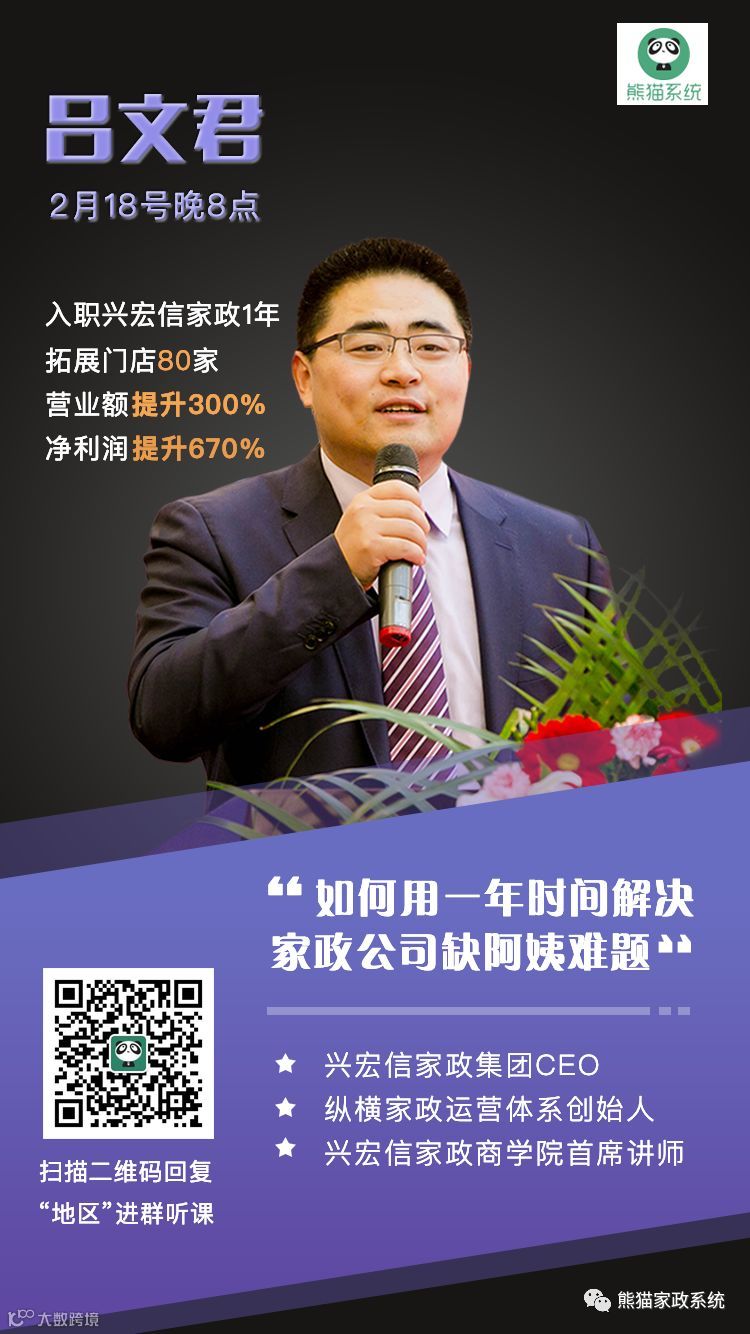 针对大多数家政公司出现的这一问题,我们邀请到了家政行业第一批职业经理人,入职一年时间将门店数量扩充至80家,用一年的时间解决了招工难的问题,实现了利润300%增长。他就是兴宏信家政集团CEO吕文君先生,2月18日晚8点,我们相约熊猫系统家政公司学习群,教大家如何用一年的时间解决家政公司缺阿姨难题!