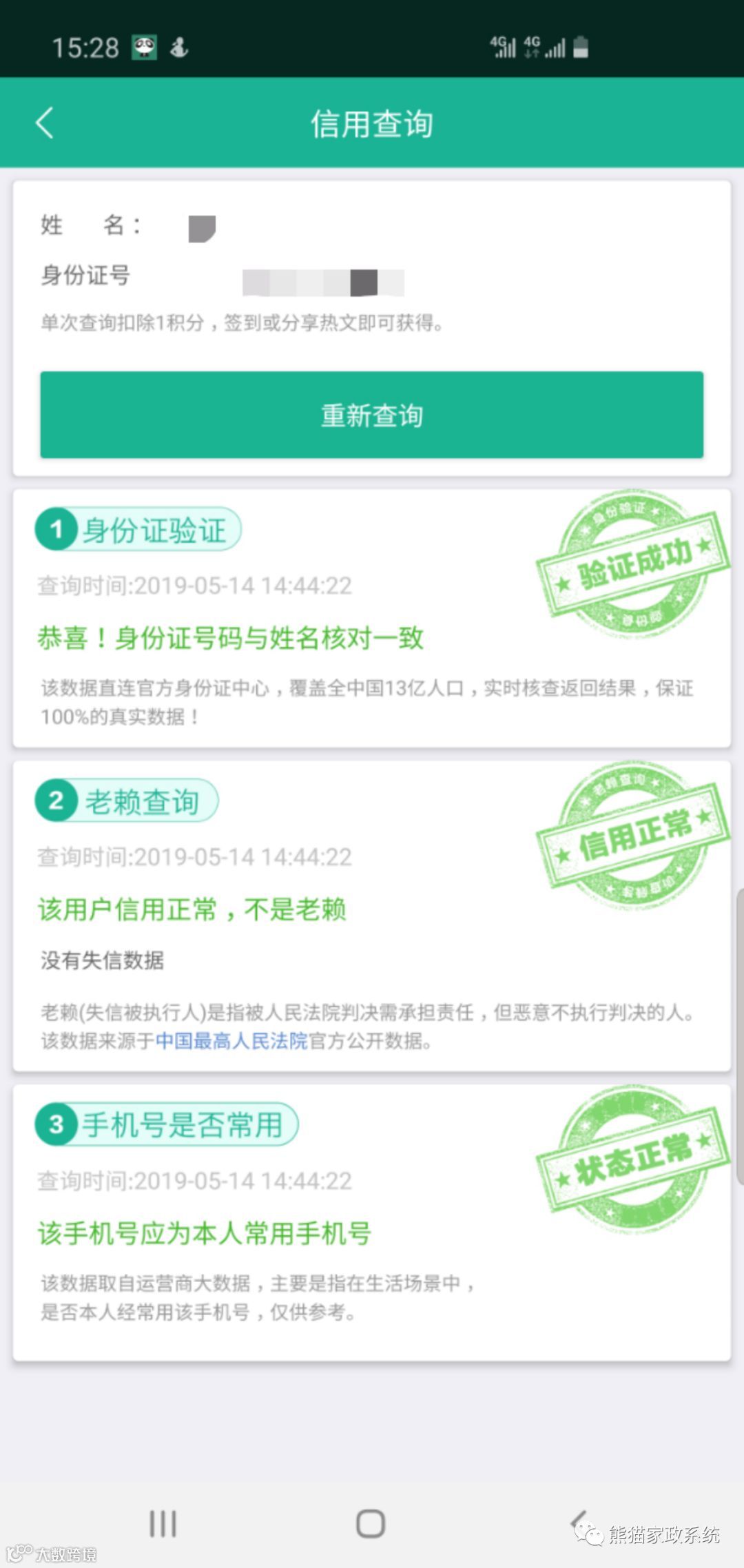 熊猫系统APP阿姨信用查询页面