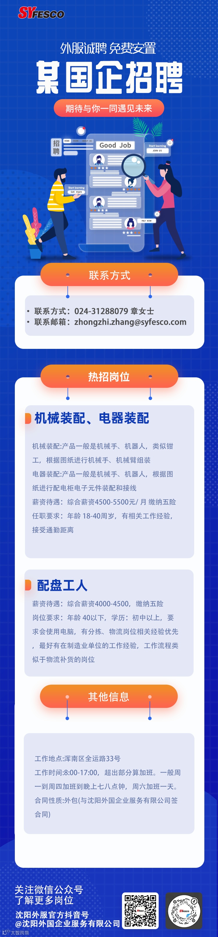 【外服诚聘|0902】某国企招聘机械装配、电器装配、配盘工人