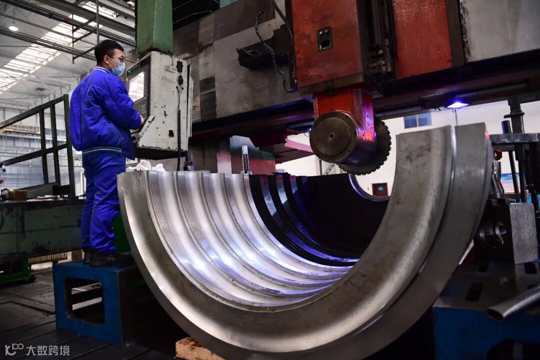 20多米高的厂房内,龙门吊车勾着巨型部件往来穿梭;巨大的五轴数控机床箱体内发出切削金属的吱吱声;操作员不时查看显示器上的各项参数……