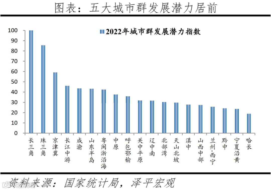 从发展潜力排名结果看,长三角、珠三角房地产投资潜力指数遥遥领先,其次是京津冀、长江中游、成渝城市群,之后是山东半岛、粤闽浙沿海、中原等城市群。