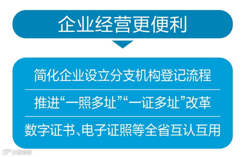 在实施企业经营便利化改革方面,《方案》提出,简化企业设立分支机构登记流程。在不违反法律法规规定、不直接涉及公共安全和人民群众生命健康的领域,推进“一照多址”“一证多址”等改革,实行住所与经营场所分离登记,企业可以申请登记一个住所和多个经营场所,促进企业扩大经营规模。推动生产经营高频事项跨区域通用。全面取消没有法律法规依据要求企业在特定区域注册的规定。数字证书、电子证照、企业生产经营高频许可证件、资质资格等逐步实现全省互通、互认、互用。