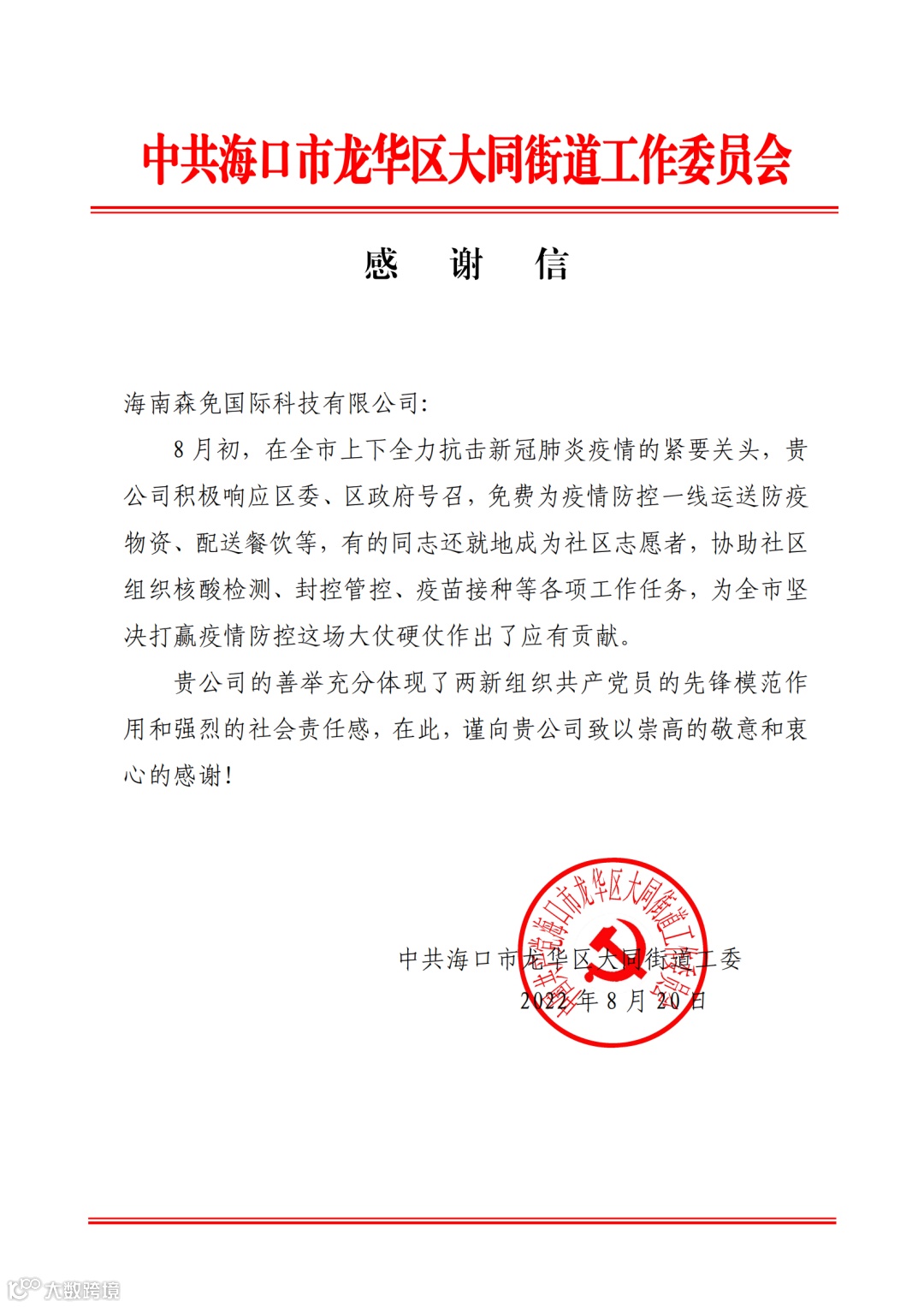 对此,龙华区大同街道工作委员会表达了感谢。
