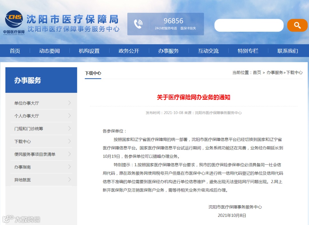 各参保单位: 按照国家和辽宁省医疗保障局的统一部署,沈阳市医疗保障信息平台已经切换到国家和辽宁省医疗保障信息平台。国家医疗保障信息平台试运行期间,业务系统功能还在完善,业务经办期延长到10月19日,各参保单位可以错峰办理业务。 特别提示:1.按照国家医疗保障信息平台要求,我市的医疗保险参保单位必须具备同一社会信用代码,原在政务服务网使用税号开户但是在市医保中心未进行统一信用代码登记的单位及信用代码信息不准确的单位需要到医保经办机构进行单位信息维护,避免出现无法登陆网厅问题出现。2.网上新开医保账户及注销医保账户业务,需等待相关业务升级完成后办理。 沈阳市医疗保障事务服务中心 2021年10月8日