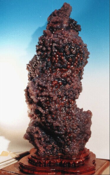 《钟馗》:中国第一葡萄玛瑙石“钟馗”葡萄玛瑙“钟馗”是一块在石界具有很高知名度的奇石。“钟馗”慨然仰天,英姿勃发,其头顶官帽,身披战袍,一身疙疙瘩瘩恰似刀枪不入的铮铮铠甲,平添几分杀气。若光线强烈,七色幻彩可透体而出,壮哉!神哉!“钟馗”巍然而立,高116厘米,宽48厘米,厚52厘米,约200公斤重,如此巨大而又威猛的造型石,为葡萄玛瑙之罕见。难怪有人管它叫做“大漠霸王石”。