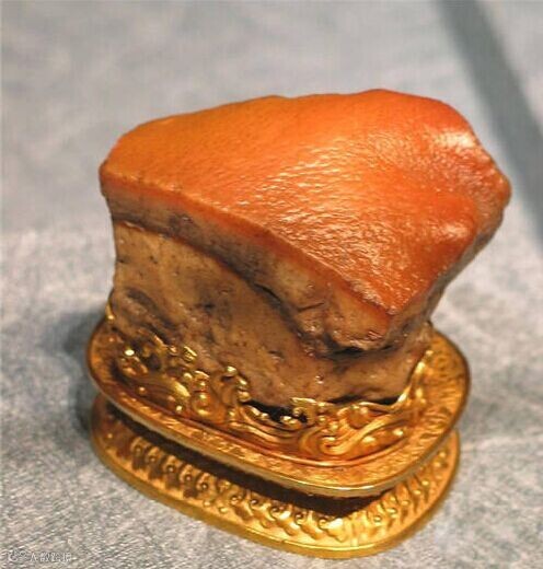 《东坡肉》:现收藏在台北故宫,如鸡蛋大小,其矿物化学成分是二氧化硅。此东坡肉形石,是一块天然的石头,色泽纹理全是天然形成,看上去完全是一块栩栩如生的五花肉块,“肉”的肥瘦层次分明、肌理清晰、毛孔宛然,肌理也相当逼真,现它与翠玉白菜、毛公鼎并称台北故宫的“镇馆三宝”。规格:5.73×6.6×5.3厘米,重量:0.52KG。