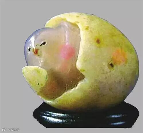 《小鸡出壳》:现收藏于北京朝阳区人民政府,小鸡出壳为天然玛瑙奇石。此石似一只色泽淡黄毛茸茸的小鸡从蛋壳内向外张望伸头欲出,形象逼真,色泽艳丽,“小鸡出壳”整体的造形以及局部的体态都与实物相仿。规格:3×2.5厘米,重量:0.092KG 。