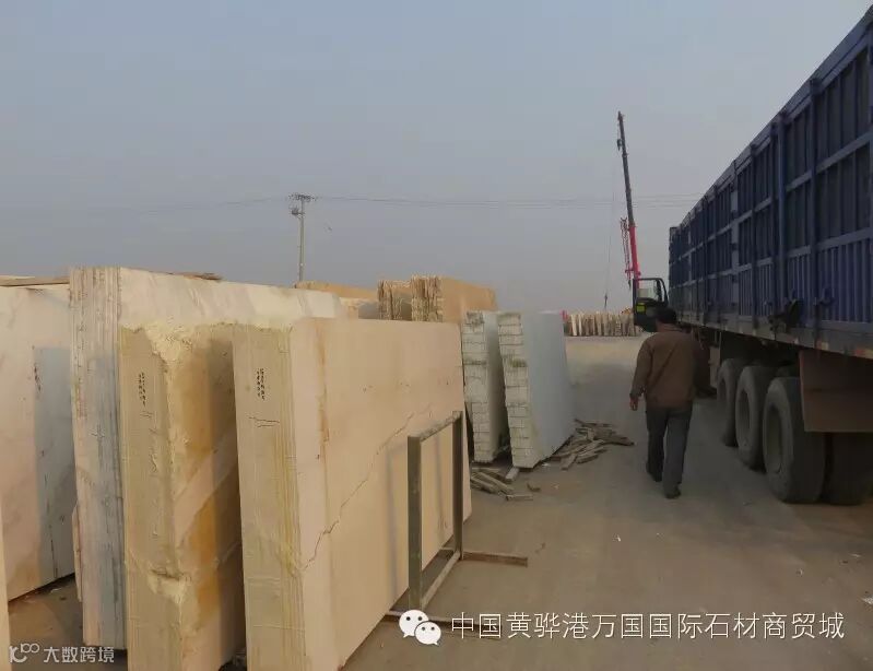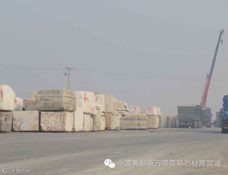 客人一行又来到荒料堆场,现场整齐堆放的几千方荒料和一排排码放的几万平米的大板石材给客人留下了深刻印象。招商员张永骏向客人讲解到:“为支持客户搬迁,商贸城给出了堆场免费使用两年的优惠政策。现场我们看到的石材,一部分是企业搬迁过来的,还有一部分是海外矿山客户从土耳其进口过来经黄骅港上岸的高档石材”。