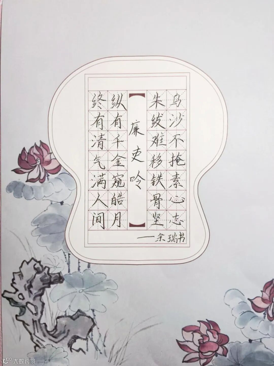 以莲之洁润色、梅之傲铸骨,笔墨诗笺与 “廉” 意相融相生。借传统艺术的雅致笔触,将崇廉尚洁的初心凝于尺幅之间,清正气韵随笔墨流转,于无声处浸润心灵。