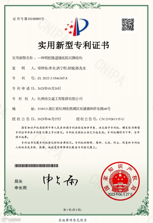 近期,公司获“一种明挖隧道隧底防沉降结构”实用新型专利授权,这一成果的获得凸显了公司对技术创新的重视,同时也为企业的科研创新注入了新的动力。