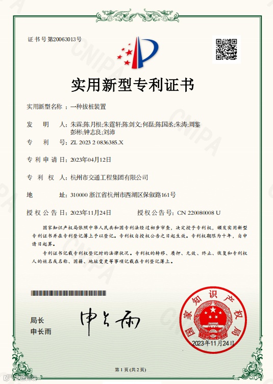 近日,公司获《一种拔桩装置》实用新型专利授权,这是本年度公司获得授权的第十二个国家专利,也是杭甬项目部自打造学习型项目部以来获得授权的第六个国家专利。