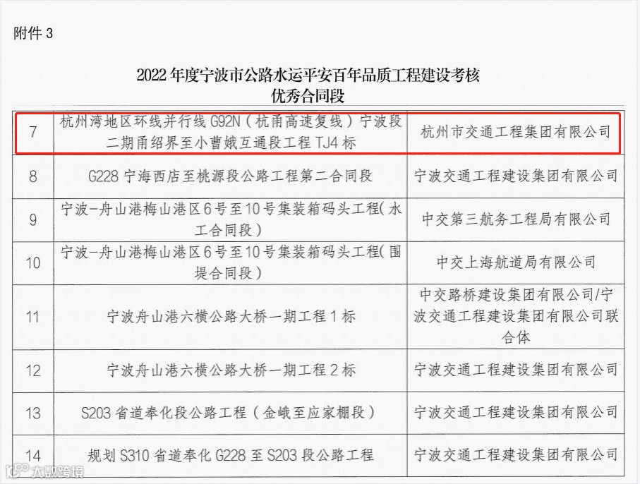 据悉,根据《宁波市公路水运平安百年品质工程建设考核办法》的要求,此次考核以区(县、市)交通运输主管部门、项目建设单位、施工单位合同段、施工班组、监理办和工地试验室为对象,采取项目自评、日常考核和年终考核相结合的方式,重点对建设管理标准化、场地标准化和施工标准化等方面内容进行了考核。