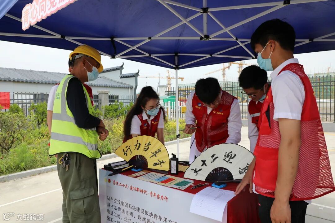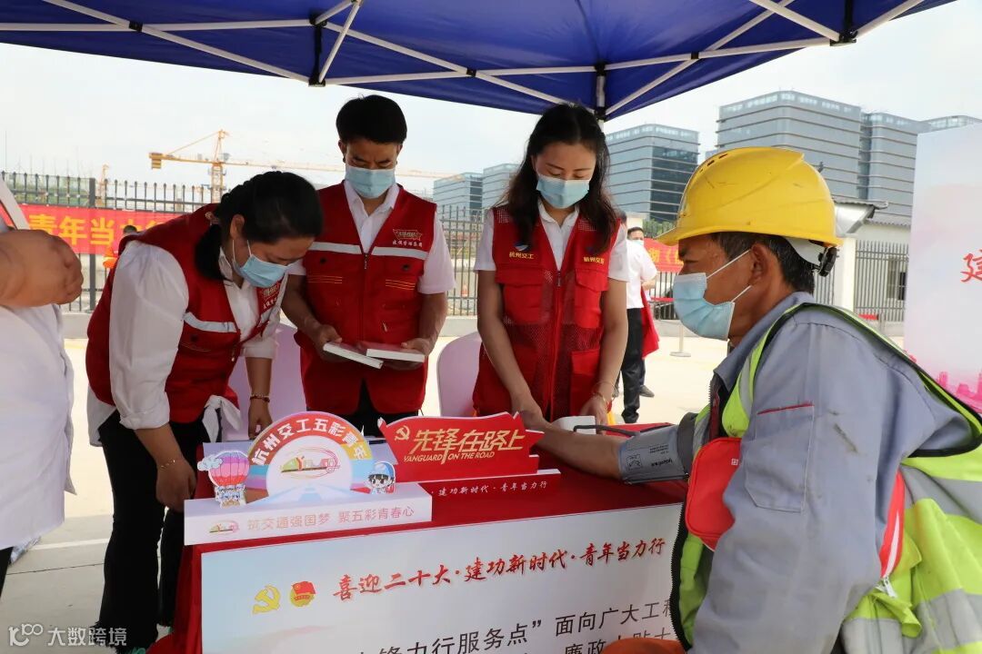 志愿号角已经吹响,服务行动扎实践行。杭州交投项目青年面向工程建设者们宣讲了工地防疫、廉洁从业、安全生产等知识,设置了党史团史有奖竞答,工友们可通过答题数目兑换防暑用品等。