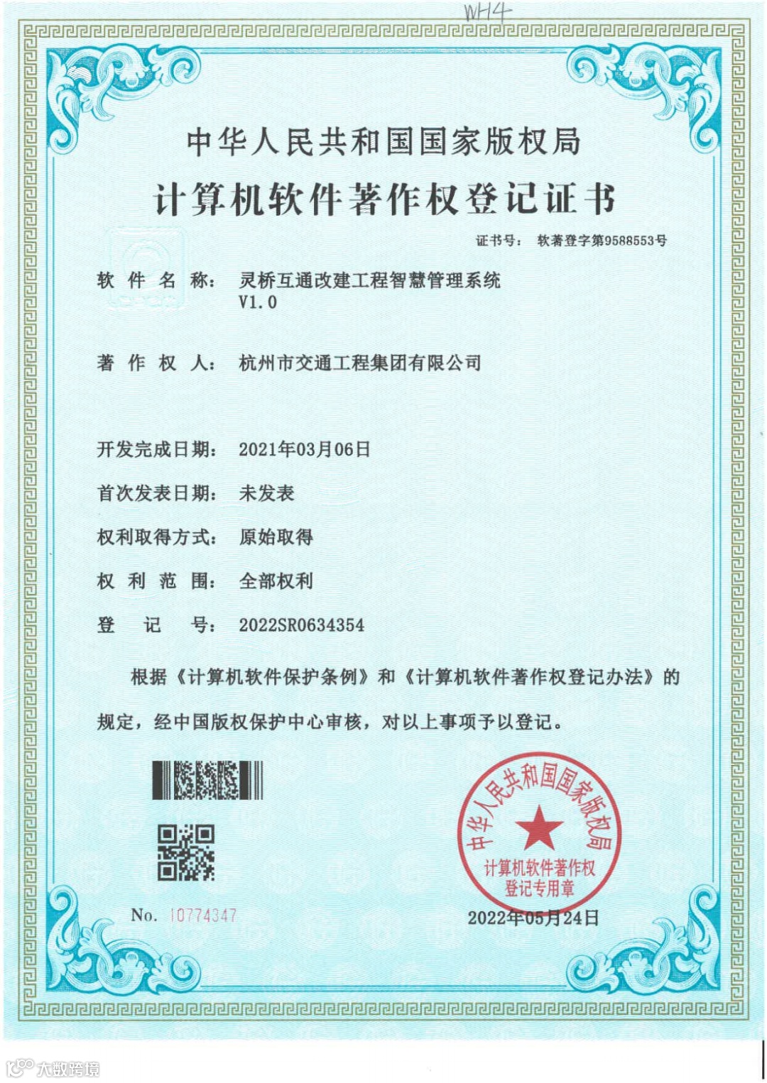在工程建设过程中,各项目技术人员积极响应“浙江开展智慧工地3年专项行动”,贯彻落实公司技术创新发展战略,发扬科研主动性,进行智慧管理系统开发,取得不俗成绩。公司于2021年3月6日完成灵桥互通改建工程智慧管理系统V1.0开发,并于今年5月24日正式获得计算机软件著作权登记证书。这意味着灵桥项目在推进工地信息化、智慧化管理上获得巨大成功,也为公司“十四五”规划科技创新领域发展树立榜样。