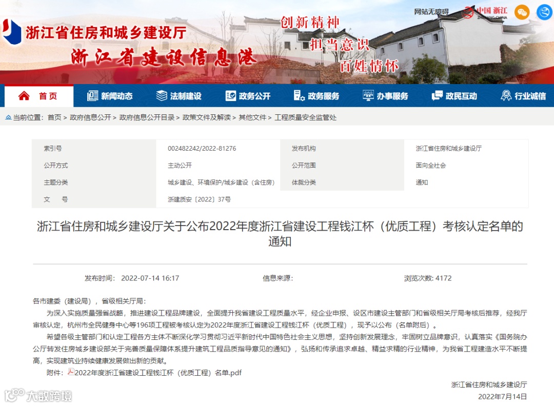 千黄高速公路项目荣获2022年度浙江省建设工程“钱江杯”(优质工程)