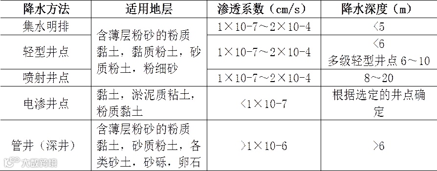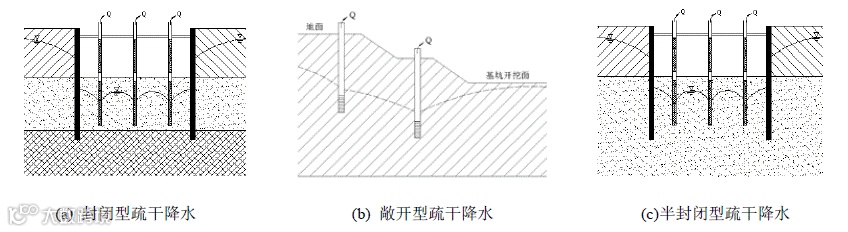 a、封闭型疏干降水;当基坑周边设置了止水帷幕,隔断基坑内外含水层之间的地下水水力联系时,一般采用坑内疏干降水;