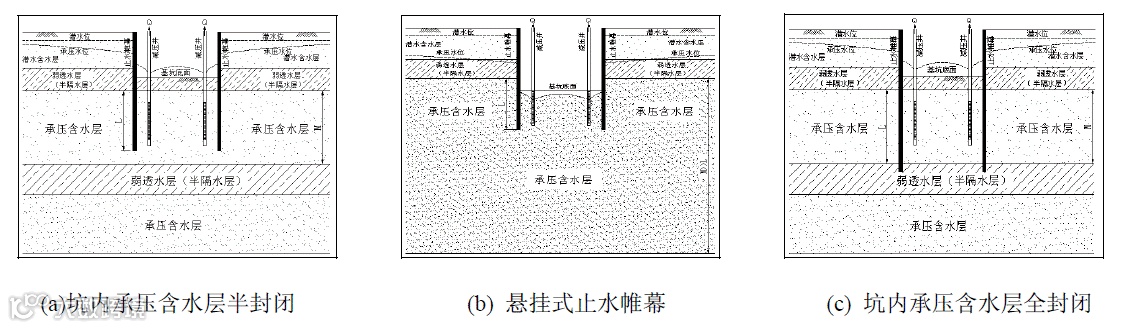 ②当止水帷幕插入承压含水层顶板以下的半隔水层或弱透水层中,隔水帷幕已完全阻断了基坑内外承压含水层间的水力联系。