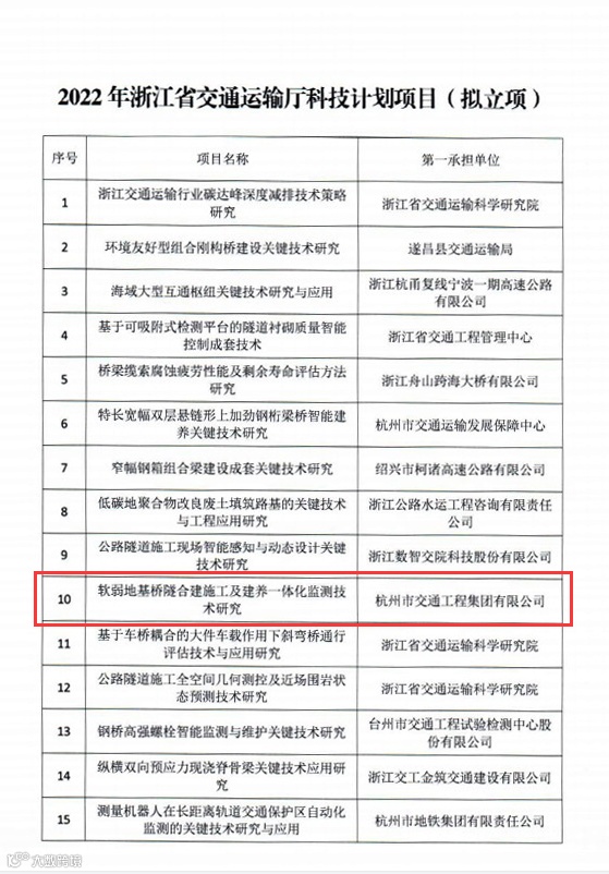 公司在建的235国道杭州老余杭至五常段改建工程,主线隧道下穿通义港大桥施工具有较强的工程实践意义。为有效厘清桥隧合建结构体系在施工及运营阶段复杂荷载作用下结构及地基的变形发展规律、软弱地基桥隧合建复杂体系变形及沉降施工控制技术、桥隧合建结构体系建管养一体化变形监测技术等,公司与浙大城市学院在基于“互联网”、“物联网”、“智慧化”等研发理念,共同开展《软弱地基桥隧合建施工及建养一体化监测技术研究》课题研究。